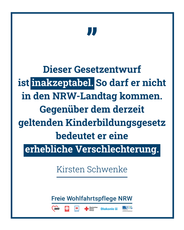 Kirsten Schwenke, Vorsitzende der Freien Wohlfahrtspflege in Nordrhein-Westfalen, macht deutlich: „Der Entwurf für das neue Kinderbildungsgesetz (KiBiz) ist inakzeptabel. Die äußerst kurze Anhörungsfrist von nur knapp sechs Wochen – zudem über die Weihnachtsferien – erschwert eine seriöse fachliche Befassung erheblich. Dass die freien Träger im Vorfeld nicht in die Erarbeitung des konkreten Gesetzestextes einbezogen wurden, ist nicht hinnehmbar. Am schwersten wiegt jedoch, dass der Entwurf inhaltlich und fachlich erhebliche Defizite aufweist. Würden Kabinett und Landtag diesen Entwurf beschließen, so würde sich die frühkindliche Bildung für die Kinder in Nordrhein-Westfalen unter anderem durch ein neu geplantes Kernzeitenmodell verschlechtern. Die Betreuungsqualität für Familien würde abnehmen und unsere Träger würden flächendeckend vor neue, nicht zu bewältigende Herausforderungen gestellt werden. Ein Beispiel dafür ist der deutlich gestiegene Bürokratieaufwand. Zeit, die dann wieder für die pädagogische Arbeit mit den Kindern fehlen würde. Für die Freie Wohlfahrtspflege ist klar: Dieser Referentenentwurf darf so nicht vom Kabinett beschlossen werden. Ein neues Kinderbildungsgesetz darf die Kinder, ihre Familien, die Träger und die Mitarbeitenden keinesfalls schlechterstellen als das bisherige, unzureichende Gesetz. Dazu sind und bleiben wir mit der Landesregierung im Gespräch.“